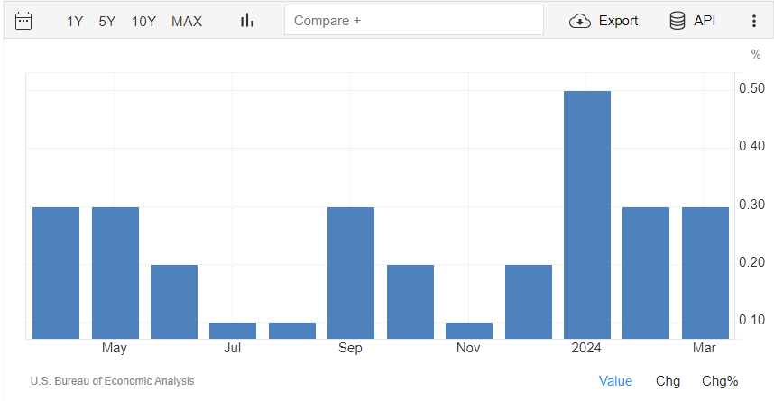 L’indice di prezzo delle spese per consumi personali core (che esclude il settore del cibo e dell’energia) a livello mensile a marzo registra un +0,3%, come indicato dal consensus e ripetendo la crescita di febbraio.