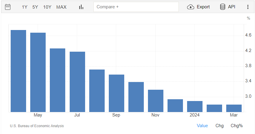 A livello annualizzato, la crescita di marzo è del 2,8%, la stessa di febbraio; il consensus indicava un +2,6%. I dati sono rilasciati dall’U.S. Bureau of Economic Analysis.
