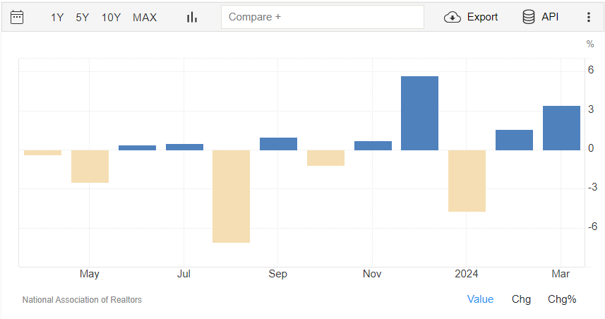 Il dato sulle vendite immobiliari in corso (che misura il cambiamento nel numero di case con contratto di vendita, ma in attesa della transazione di chiusura, escludendo le nuove costruzioni) a livello mensile a marzo cresce del 3,4%. Si tratta di una crescita superiore a quella indicata dal consensus del +0,3% e a quella del mese di febbraio del +1,6%. Il dato è rilasciato dalla National Association of Realtors.