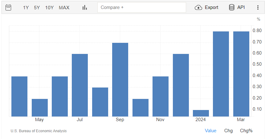La spesa personale, invece, a livello mensile a marzo segna un +0,8%, stessa crescita registrata a febbraio e sopra al consensus del +0,6%. Il dato è rilasciato dall’U.S. Bureau of Economic Analysis.