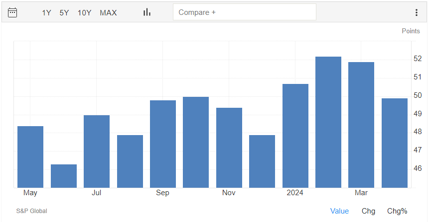 Il dato preliminare di aprile del PMI manifatturiero S&P Global è pari a 49,9 punti, in calo rispetto ai 51,9 punti di marzo e sotto al consensus di 52,0 punti.
