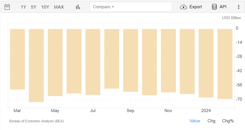 La bilancia commerciale di beni e servizi a febbraio si attesta a -68,9 miliardi di dollari, rispetto ad un consensus di -67,3 miliardi ed un dato di gennaio di -67,6 miliardi (rivisto da -67,4 miliardi). Il dato è rilasciato dall’U.S. Bureau of Economic Analysis.