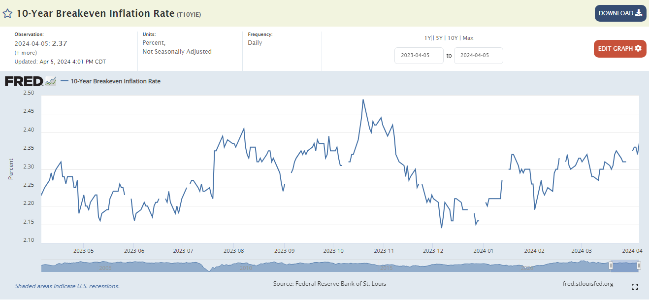Infine i tassi reali, al netto dell’attuale tasso di inflazione, mostrano il grafico del breakeven inflation a 10 anni che si alza al 2,37% come nel novembre 2023, dal 2,32% della fine di marzo (v. grafico):