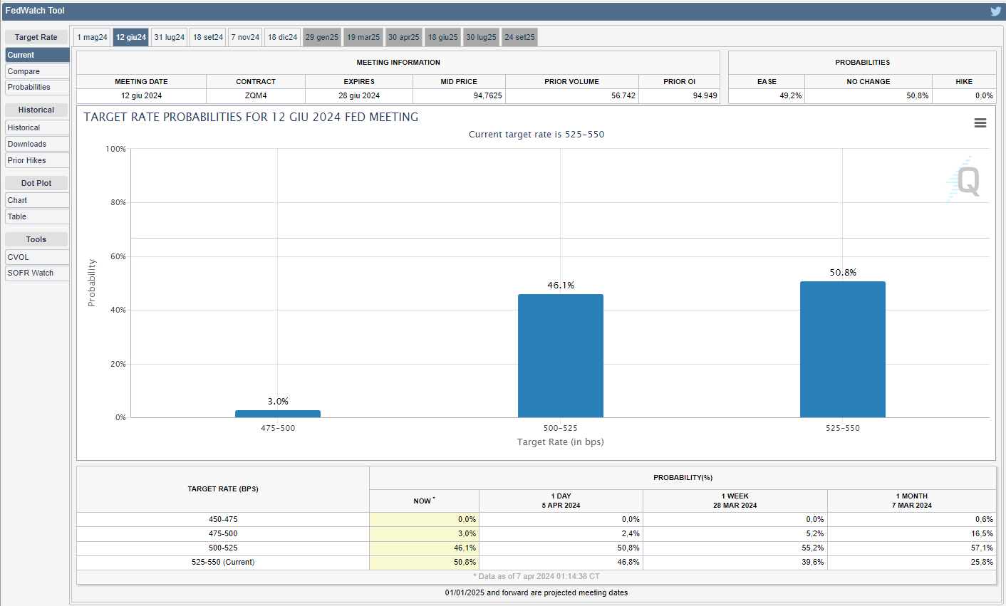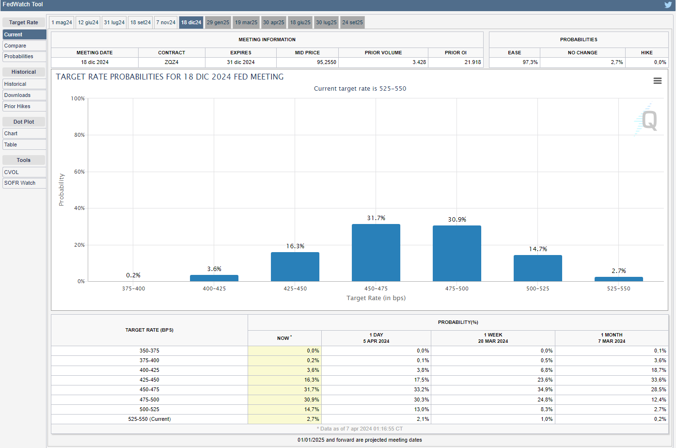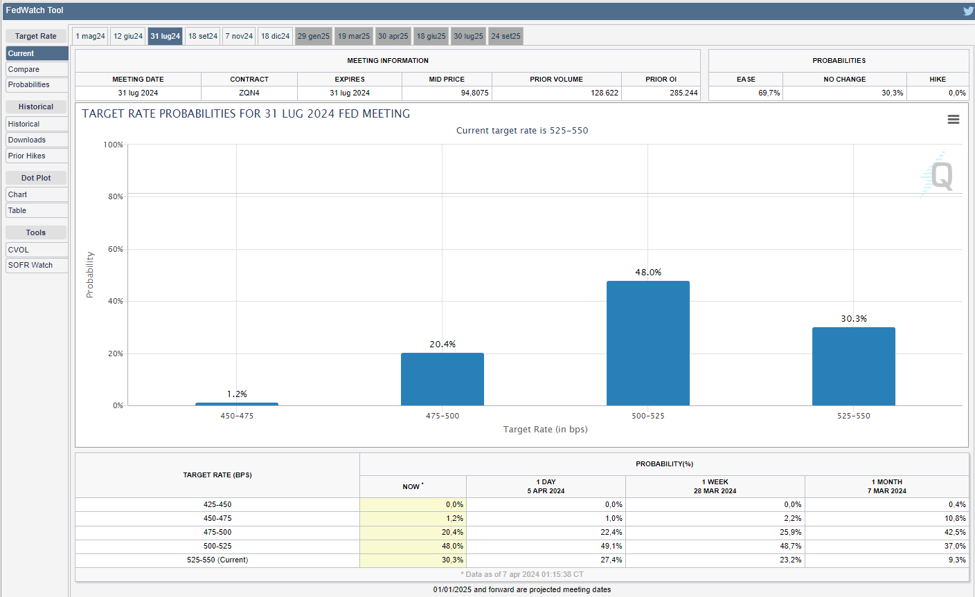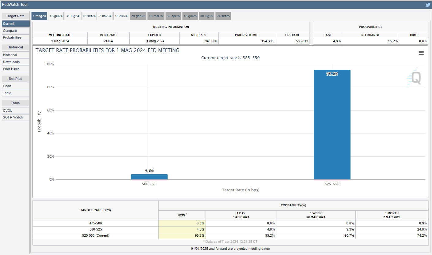 Lo strumento FedWatch del CME Group mostra come i mercati, per la successiva riunione del 2024 in programma il 1° maggio, prezzino una probabilità del 95,2% di mantenere i tassi fermi rispetto all’90,7% di due venerdì fa e del 74,2% di un mese fa (v. grafico):