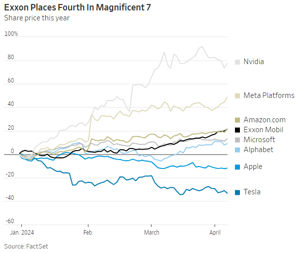 L'S&P500, in questo contesto di consolidamento, comunque fa registrare una reattività davvero incredibile (v. la giornata di venerdì scorso dopo il giovedì disastroso) anche se il momentum è in lieve discesa. Nella settimana appena trascorsa il settore dell’energia ha sopravanzato il settore tecnologico a livello di performance nell’anno. Gli investitori non si sono dimenticati dell’inflazione, ma l’hanno messa da parte per concentrarsi su un’economia più forte del previsto, che stimola la domanda di petrolio. Il settore energetico dell’S&P500, di cui Exxon è il membro più grande, venerdì scorso ha superato anche il settore dei servizi di comunicazione, in cui siedono Meta e Alphabet. Exxon è al centro di due storie dopo la forte impennata delle quotazioni di venerdì scorso: l’aumento della domanda di petrolio poiché l’economia globale è più forte del previsto e i problemi di approvvigionamento a causa delle guerre in Ucraina e Medio Oriente. Entrambi le situazioni si sono evidenziate nella scorsa settimana, quando il petrolio è salito sulla scia dei forti dati sull'occupazione, un giorno dopo che era stato spinto al rialzo dalla preoccupazione per l'escalation tra Israele e Iran. I titoli petroliferi risultano vincitori in entrambi i casi, mentre la maggior parte del mercato preferisce l’uno o l’altro. Nel seguente grafico viene mostrata la performance del 2024 di EXXON rispetto ai cosiddetti ‘Magnificent Seven’: