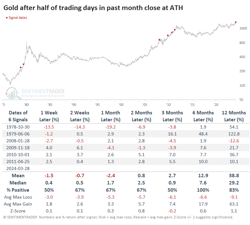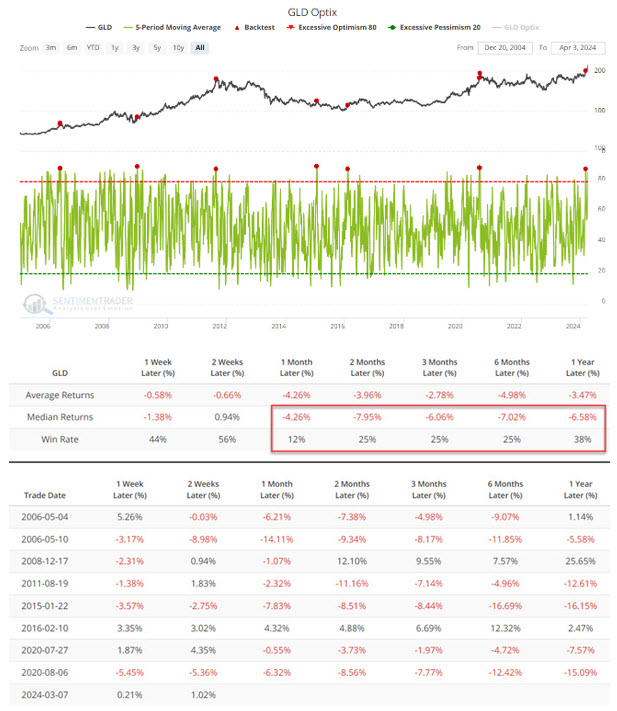 Infine, per completezza di informazione riportiamo due studi sull'Oro di Sentimentrader dalle conclusioni apparentemente contrastanti. Il primo riguarda il fatto che dopo aver registrato nuovi massimi a inizio anno ha messo su un altro comodo 10%, osservando che quando il livello di ottimismo sull'Oro è arrivato agli estremi, la performance successiva, fino a 12 mesi, è stata in media deludente, con un paio di eccezioni.