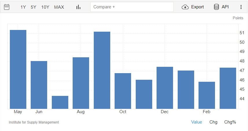 L’indice di occupazione del settore manifatturiero rilasciato da ISM a marzo è a 47,4 punti, in crescita rispetto ai 45,9 punti di febbraio.