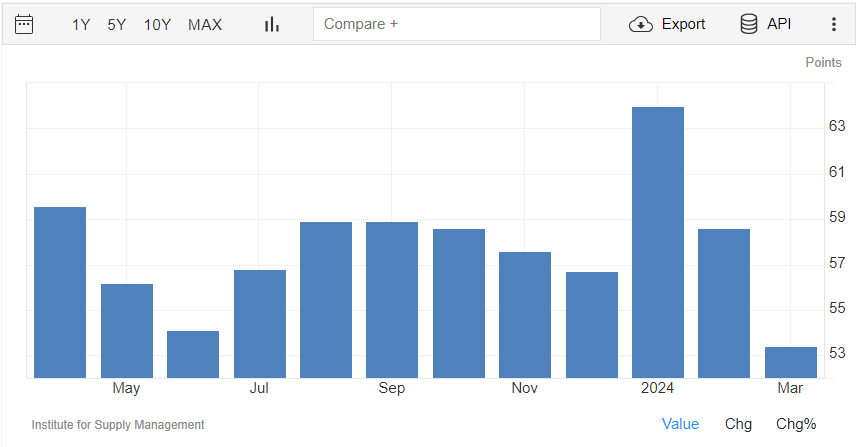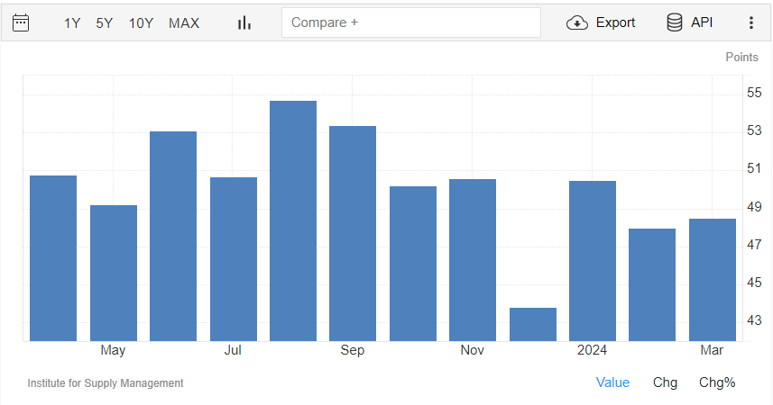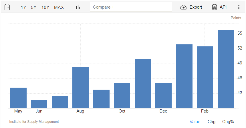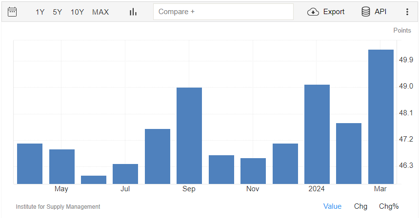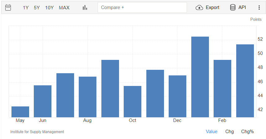 Il PMI manifatturiero rilasciato da ISM a marzo è pari a quota 50,3 punti, oltre il dato di febbraio di 47,8 punti.