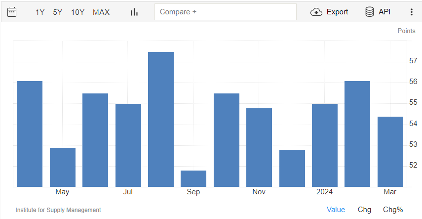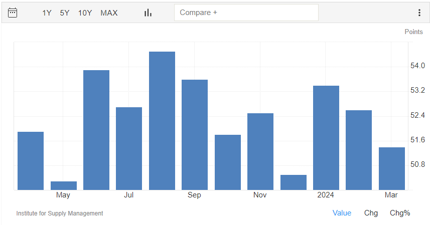 Il PMI del settore dei servizi rilasciato da ISM, invece, a marzo si attesta a quota 51,4 punti, con una contrazione rispetto ai 52,6 punti di febbraio e sotto al consensus di 52,7 punti.