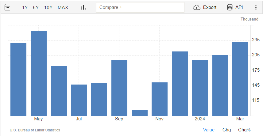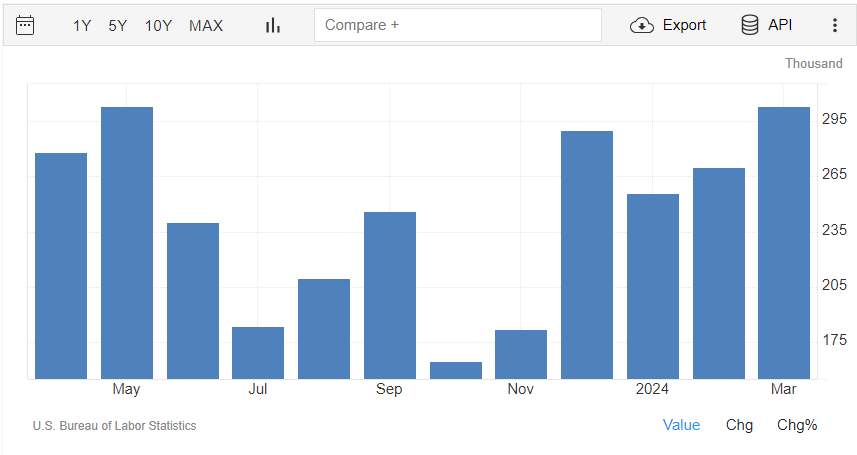 Nel settore non-agricolo a marzo sono stati creati 303 mila posti di lavoro, oltre il consensus di 200 mila ed in crescita rispetto ai 270 mila posti di lavoro creati a febbraio (rivisti da 275 mila).