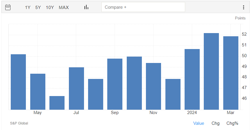 Il PMI manifatturiero S&P Global a marzo si attesta a quota 51,9 punti, rilevazione inferiore al dato preliminare di marzo di 52,5 punti ed al dato di febbraio di 52,2 punti.