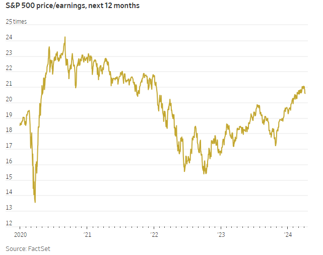 Secondo FactSet, le stime sugli utili per il resto del 2024 sono ottimistiche. Gli analisti prevedono che i profitti delle società dell’S&P500 aumenteranno di circa l’11% per l’anno. Se i risultati dovessero risultare più deboli, ciò potrebbe comportare il rischio di far apparire le azioni più costose rispetto ai profitti delle società in futuro. Gli investitori spesso utilizzano il rapporto prezzo/utili come indicatore per valutare se le azioni appaiono economiche o costose (v. grafico):