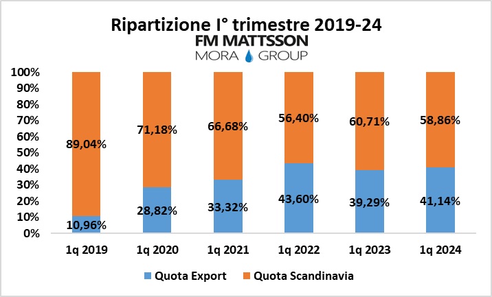 Per effetto di ciò, l'Export aumenta la propria quota raggiungendo il 41,14% del totale dei ricavi.