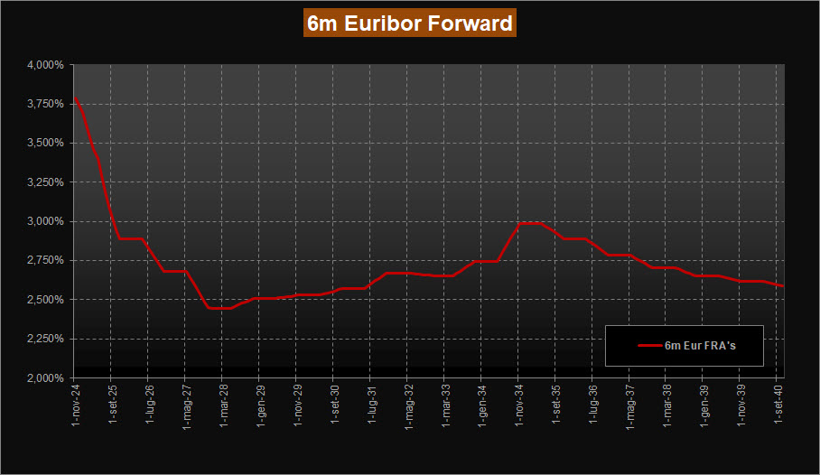 Si muovono un po’ le previsioni fornite dai tassi forward su Euribor 6 mesi sulle scadenze a breve, con tassi attesi ora in area 3,75% per fine 2024 rispetto ad area 4,00%, denotando una decisa convinzione di un taglio dei tassi dello 0,25% da parte della Bce. Nel suo complesso la curva scende sempre repentinamente e si ferma ora poco sotto area 2,50% verso fine 2027. La risalita dei tassi è per ora sempre vista ad inizio 2028, con una progressione che conduce ad un massimo in area 3,00% nel tratto 2034/3035, per poi riprendere a scendere.