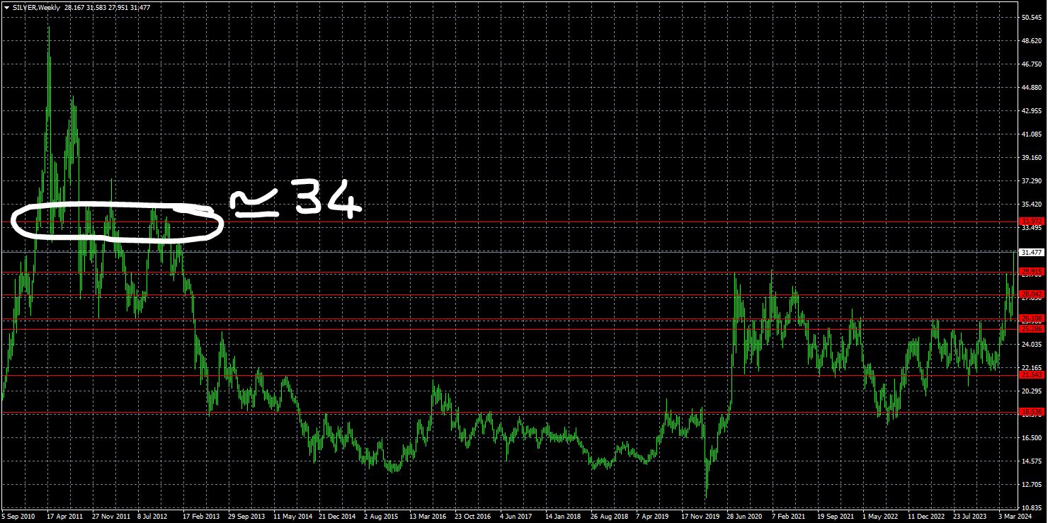 Su scala settimanale (che purtroppo ho dovuto comprimere proprio perché si tratta di livelli non toccati dal 2012-2013) la prima resistenza importante è collocabile attorno a 34 usd.