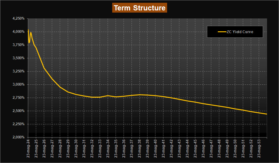 Invariato il tratto a breve, con la curva che esprime ancora un massimo di rendimento sulle scadenze corte nella seconda metà del 2024 sempre poco sotto area 4,00% come già osservato nella scorsa analisi.