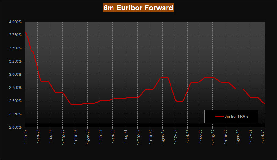 Stabili anche le previsioni fornite dai tassi forward su Euribor 6 mesi sulle scadenze a breve, con tassi attesi sempre in area 3,75% per fine 2024 confermando le attese per un taglio dei tassi dello 0,25% da parte della Bce. Nel suo complesso la curva scende sempre repentinamente e si ferma sempre poco sotto area 2,50% per le scadenze 2027-2029. Si sposta quindi in avanti la previsione di risalita dei tassi, ora vista a fine 2029, con una progressione graduale sino al 2032 per poi impennarsi nervosamente nel tratto 2032-2034 che porta ad un massimo in area 3,00%.