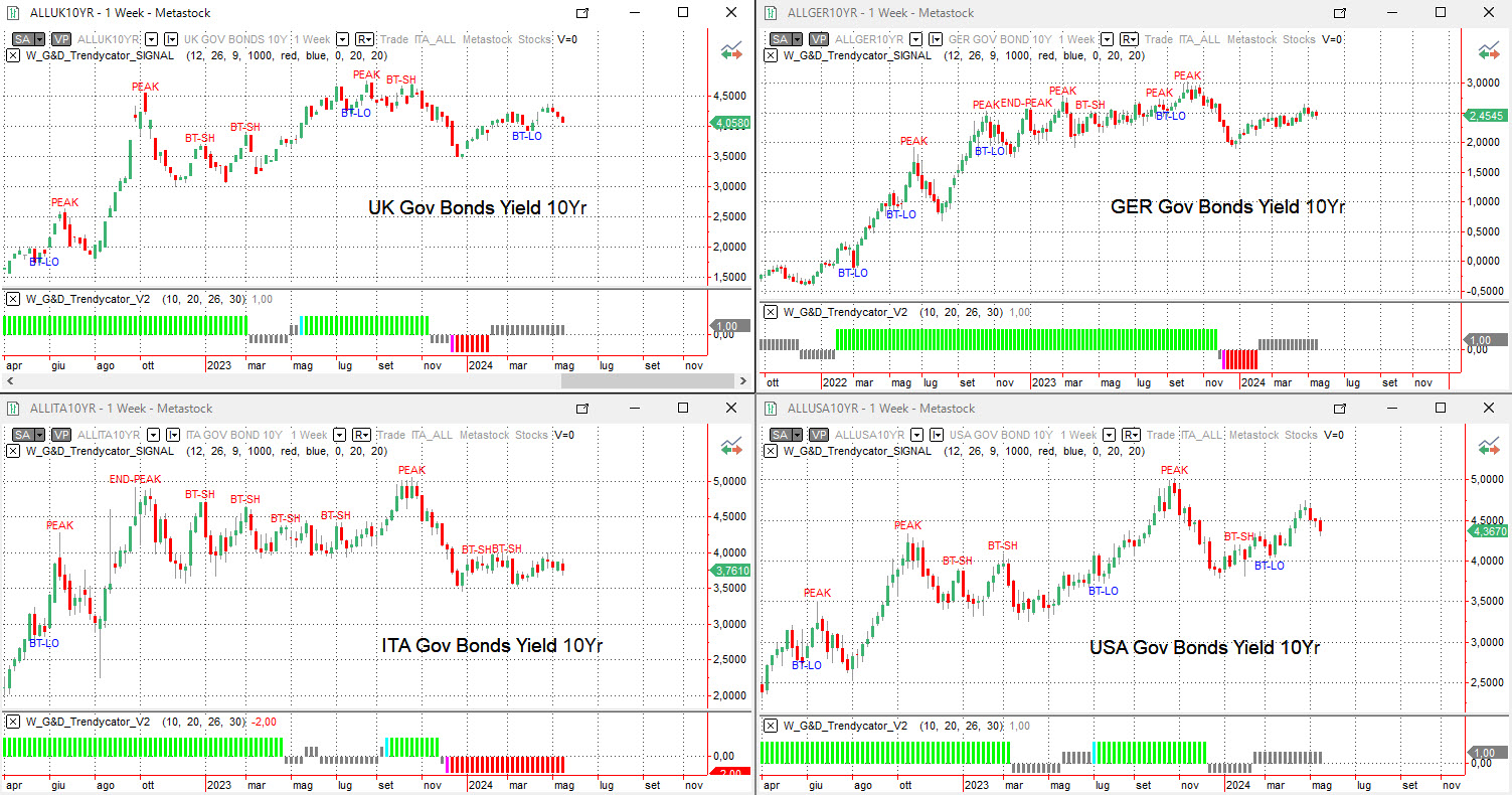 Analizzando con il Trendycator le curve dei rendimenti su scala settimanale dei principali benchmark decennali si nota ancora il perdurare della fase di assestamento che ci accompagna ormai da diverse settimane, complici le attese sulle prossime mosse di politica monetaria.