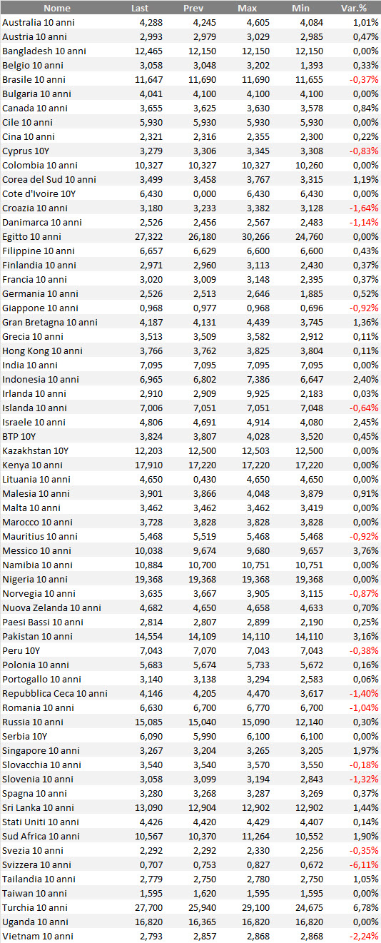 Tabella dei rendimenti, su base settimanale, delle obbligazioni governative mondiali con qualunque rating.