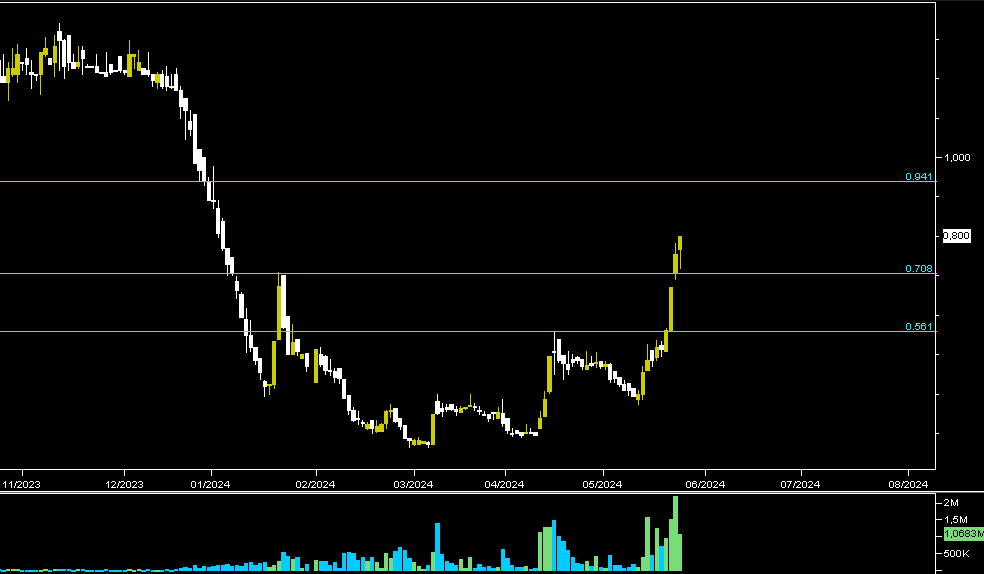 Un salto spettacolare compiuto grazie ad alcune rotture grafiche che hanno visto l'inizio del movimento con la rottura di una resistenza di breve ai 0.56€ per poi bucare, in una seduta che ha visto più episodi di sospensione al rialzo, il bypass dell'area agli 0.71€.