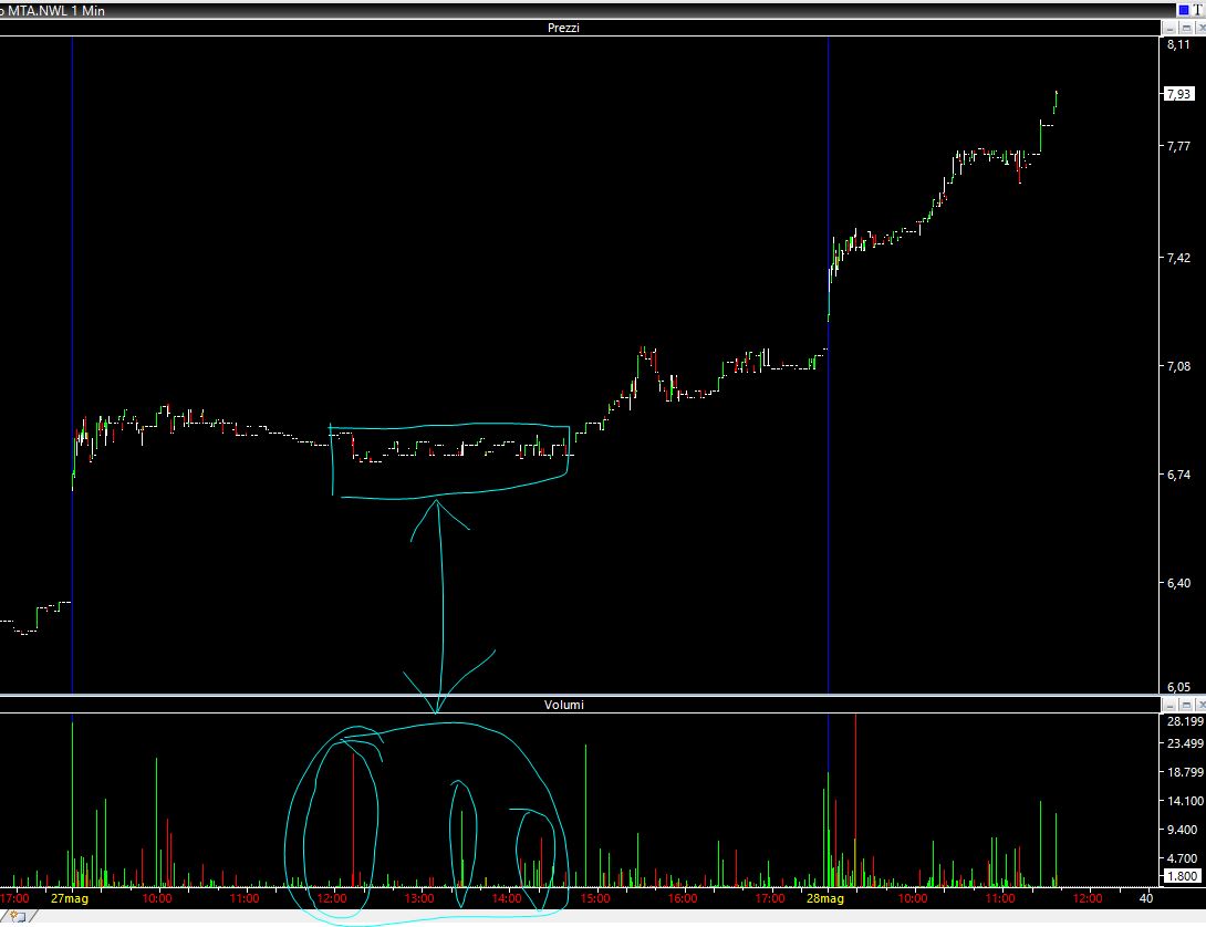 Come scritto ieri sera, mi ero accorto di un software tarato male che continuava a vendere ad un prezzo sbagliato: il titolo cercava di scappare ma "lui" (fesso) risultava venditore. In questi casi si può naturalmente sfruttare la manipolazione algoritmica. In che modo? Semplicemente facendosi servire, tanto poi il software sarà costretto a ribaltare la posizione (hanno una determinata size nella taratura visto che operano sul volume). Dovendo uscire per il consueto allenamento, ho lasciato un ordine limitato a 6,80 dove sono stato eseguito un'ora dopo. Nel grafico che vedete notate come ci fossero volumi (contro la macchinetta) tra le ore 12 e le 14. Esaurita la vendita del software c'è poi stato il decollo (il grafico al minuto che trovate in seguito arriva fino alla mattinata di oggi). Ovviamente vista la chiusura ho mantenuto la posizione ed oggi l'azione è salita di un altro 10% abbondante e in questi casi le varie macchinette non possono far altro che rincorrersi negli acquisti, specialmente quelle che tendono a "scavallare" gli ordini, autoalimentando un treno in corsa. Del resto nella mia testa non si trattava di una operazione di scalping o di intraday.