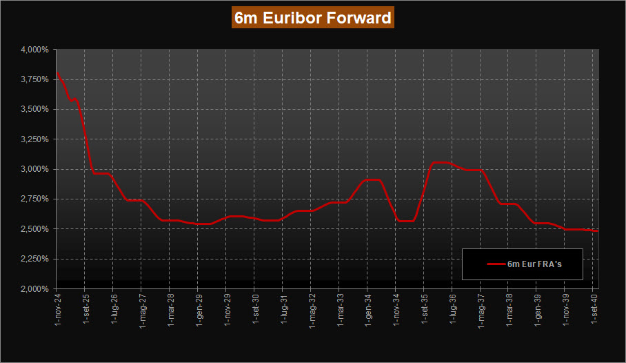 Si modificano le previsioni fornite dai tassi forward su Euribor 6 mesi sia sulle scadenze a breve, con tassi attesi ora un po’ sopra area 3,75% per fine 2024 confermando comunque le attese per un taglio dei tassi dello 0,25% da parte della Bce, sia sulla parte a medio e lungo. Infatti, nel suo complesso la curva scende sempre repentinamente ma si ferma ora in prossimità di area 2,60% per le scadenze 2027-2031. Questo indica che il mercato si attende una minore incisività della Bce sul fronte taglio tassi. Si sposta quindi in avanti la previsione di risalita dei tassi, ora vista a fine 2031, con una progressione graduale sino al 2033 per poi impennarsi nervosamente nel tratto 2035-2036 che porta ad un massimo ora oltre area 3,00%.