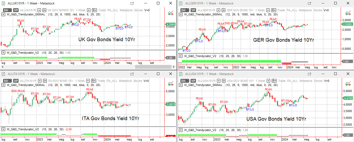 Analizzando con il Trendycator le curve dei rendimenti su scala settimanale dei principali benchmark decennali si nota molto bene la mancanza di una chiara direzionalità e la fase di attesa in cui si trovano i mercati, per le ragioni viste sopra.