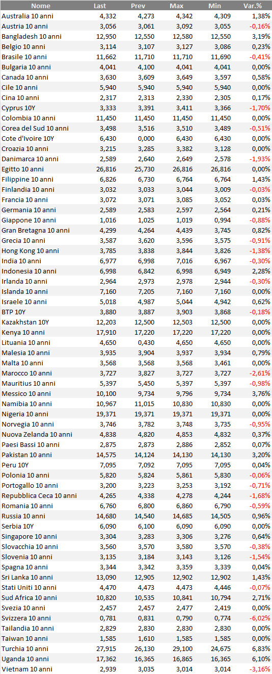 Il ranking considera i bond benchmark decennali in tutte le valute di emissione.