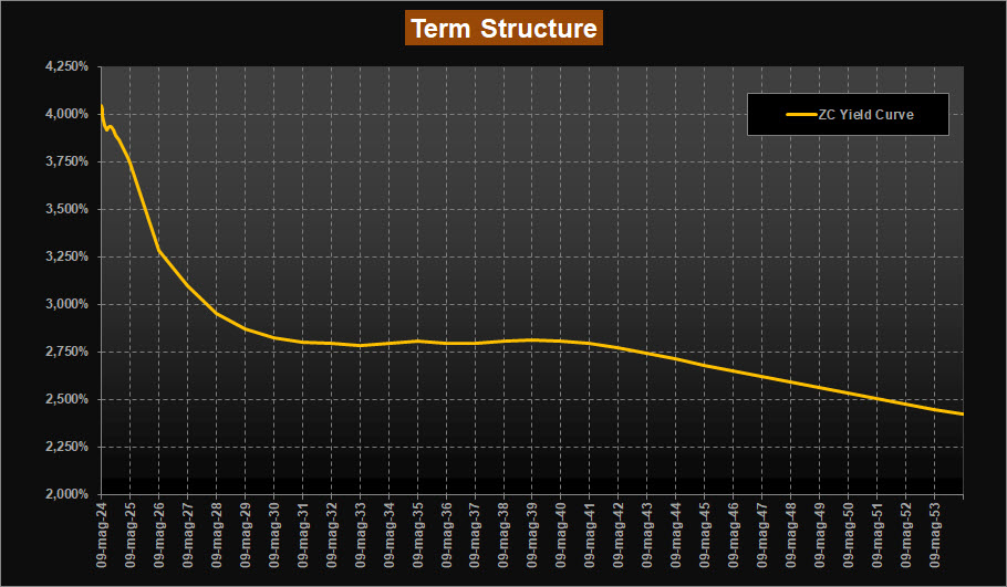 Leggera variazione sul tratto a breve, con la curva che esprime ora un massimo di rendimento sulle scadenze corte nella seconda metà del 2024 ora poco sotto area 4,00% rispetto ad area 4,05% della scorsa analisi.