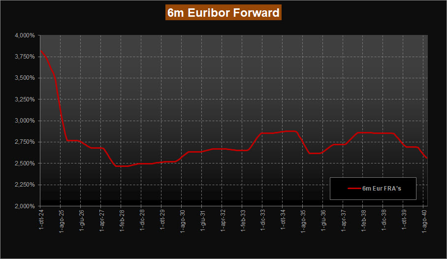 Di fatto confermate al momento le previsioni dei tassi forward su Euribor 6 mesi sulle scadenze a breve, con tassi attesi sempre poco sotto area 4,00% per la seconda metà del 2024, così come risultano poco variate le attese sulla dinamica dell’atteso taglio dei tassi. Infatti, la curva scende sempre repentinamente e si ferma in area 2,50% solo verso fine 2027 invece che verso fine 2025 rispetto ad alcune settimane fa. La risalita dei tassi è per ora vista sempre ad inizio 2028, data dalla quale sono visti in progressione ma ora con una puntata sino a poco sotto area 3,00% nel tratto a lunga.
