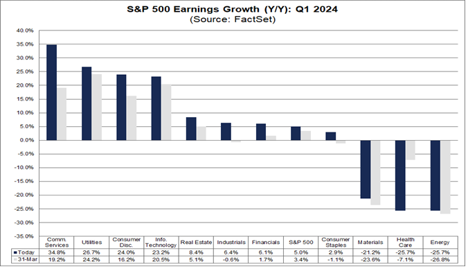 In questa fase della stagione degli utili del primo trimestre, le società dell’S&P500 continuano a ottenere buoni risultati rispetto alle aspettative. Sia la percentuale di società che segnalano sorprese positive sugli utili, sia la loro entità, sono superiori alle medie decennali. Nel complesso, fino ad oggi l’80% delle società dell’indice S&P500 ha riportato risultati effettivi per il primo trimestre del 2024. Di queste società, il 77% ha riportato un utile per azione effettivo superiore alle stime pari al 7,5%, che sono superiori alla media decennale del 6,7%. Otto degli undici settori segnalano una crescita degli utili anno su anno, guidati dai settori dei servizi di comunicazione, dei servizi di pubblica utilità, dei beni di consumo voluttuari e dell'informatica. D’altro canto, tre settori stanno segnalando un calo degli utili rispetto all’anno precedente: energia, sanità e materiali: