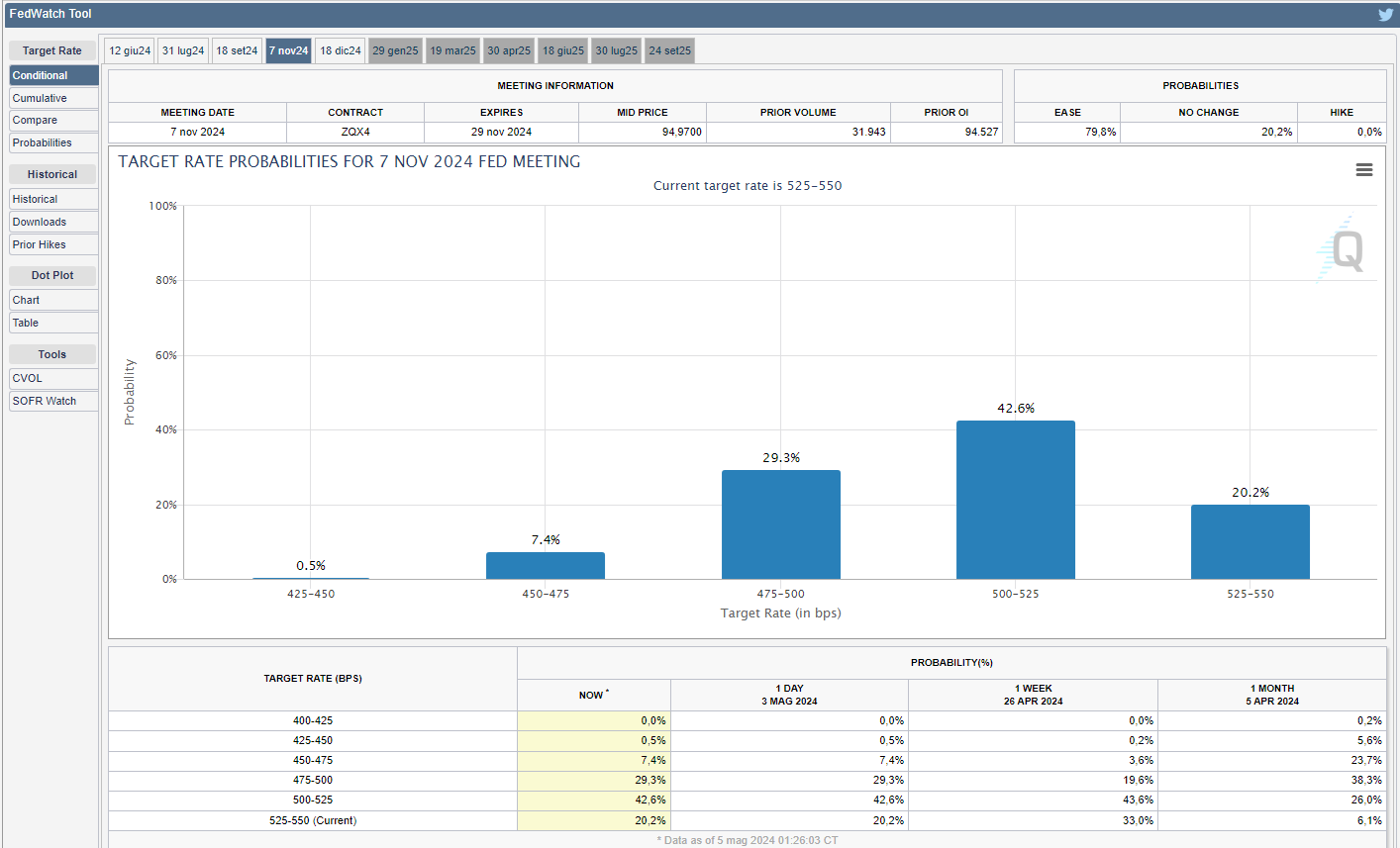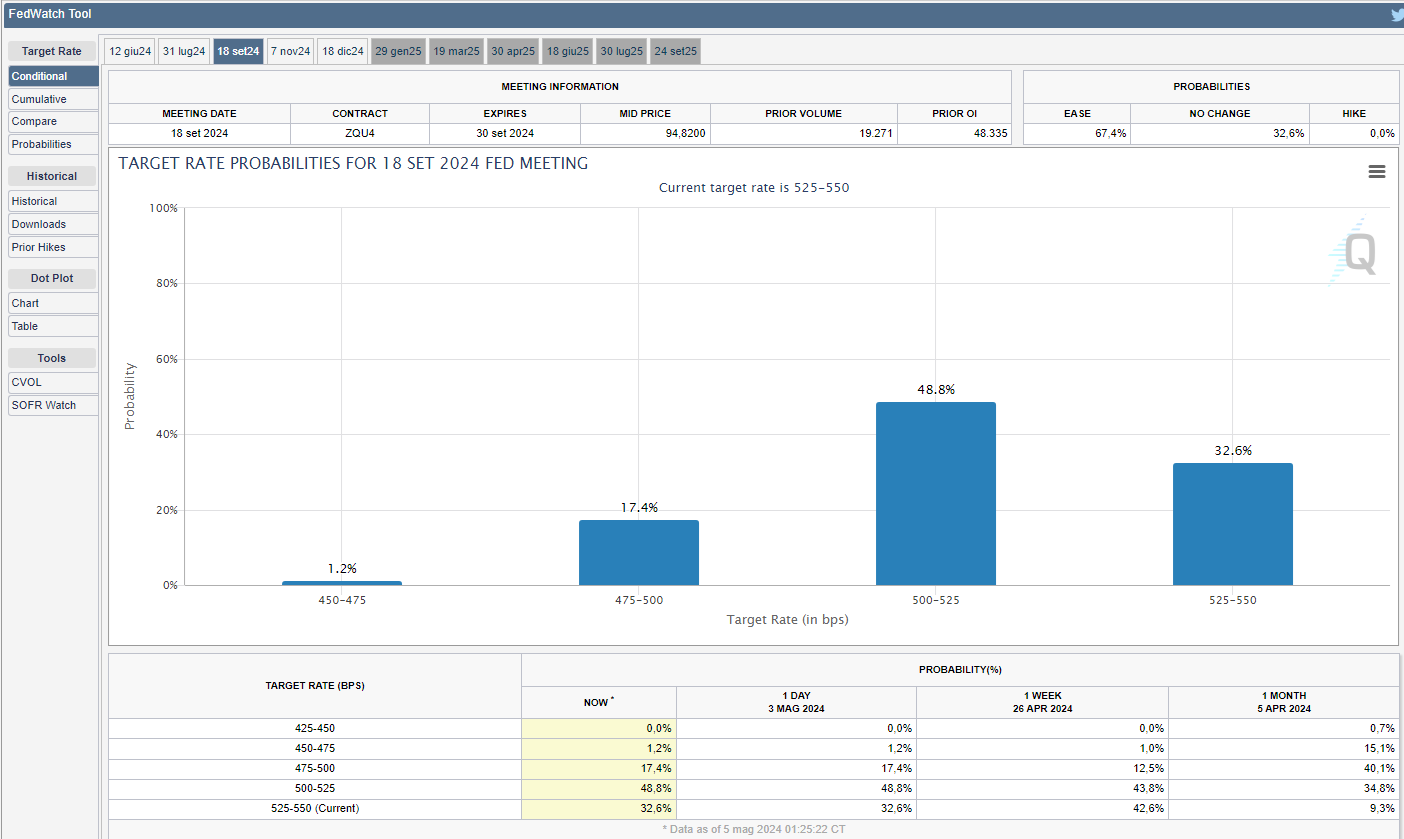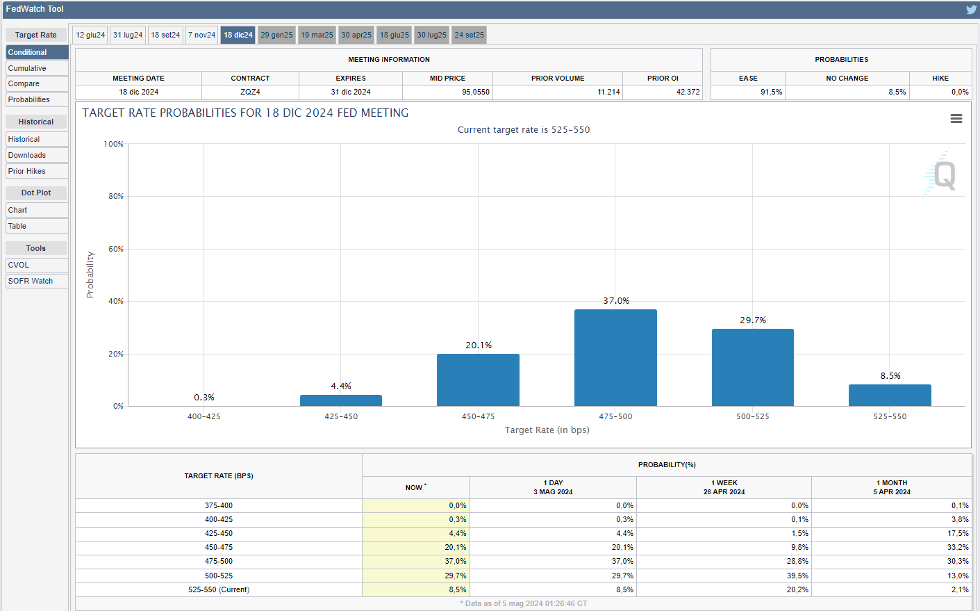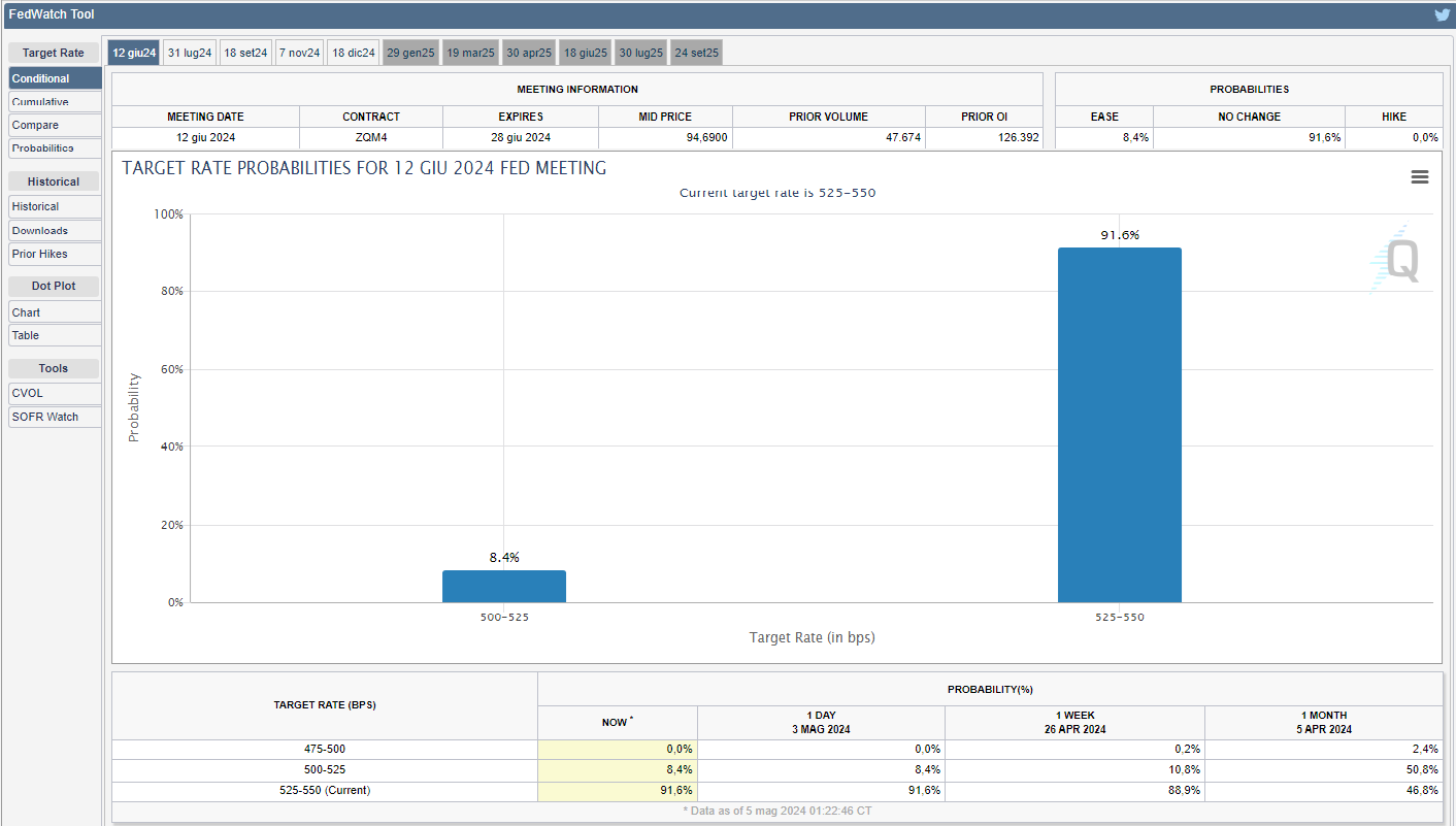 Passata anche la riunione di mercoledì scorso con un nulla di fatto, lo strumento FedWatch del CME Group mostra come i mercati, per la successiva riunione del 2024 in programma il 12 giugno, prezzino una probabilità del 91,6% di mantenere i tassi fermi in rialzo in aumento rispetto all’88,9% di due venerdì fa (v. grafico):