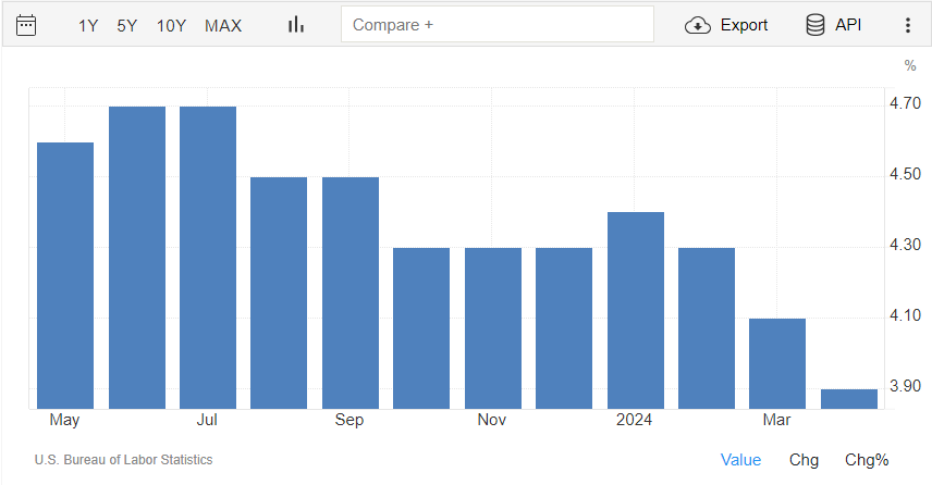 Il tasso di disoccupazione registra una leggera crescita, passando dal 3,8% di marzo al 3,9% di aprile, sopra al consensus che indicava una situazione stabile al 3,8%. Il dato è rilasciato dall’U.S. Bureau of Labor Statistics.