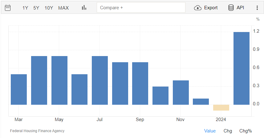 L’indice di prezzo delle case a febbraio tocca quota 423,0 punti, realizzando una crescita dell’1,2% rispetto al dato di gennaio di 417,8 punti (rivisto da 417,5 punti). Il dato è rilasciato dalla Federal Housing Finance Agency.