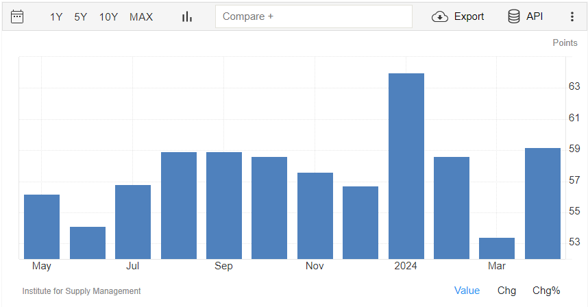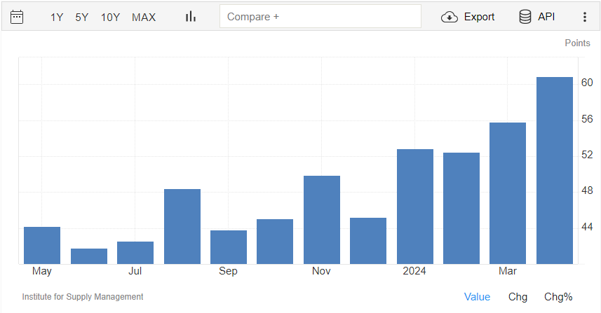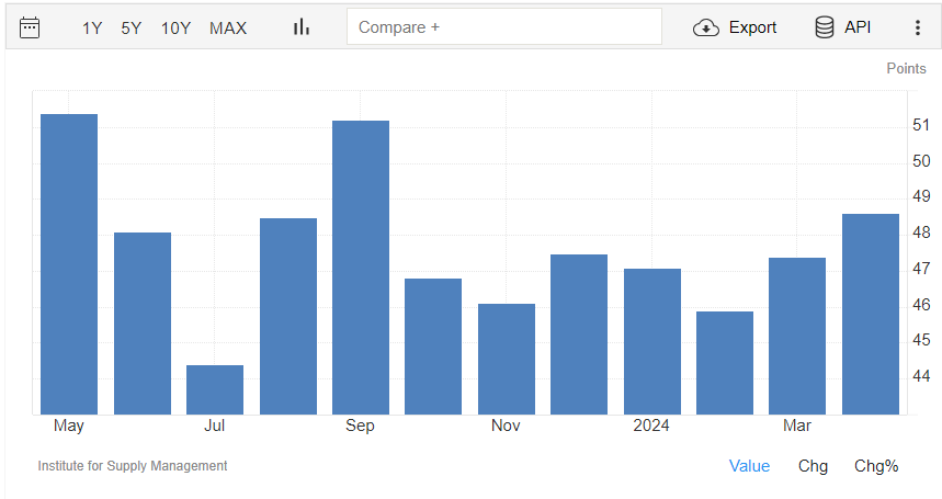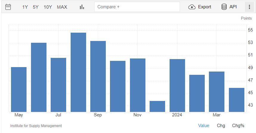 Il dato del Chicago PMI, è sceso a 37,9 nell'aprile 2024, in calo rispetto a 41,4 del mese precedente e al di sotto delle previsioni di mercato di 45. L'ultima lettura ha indicato che l'attività economica di Chicago si è contratta per il quinto mese consecutivo in aprile, e a un ritmo sostenuto, segnando il calo più forte da novembre 2022.