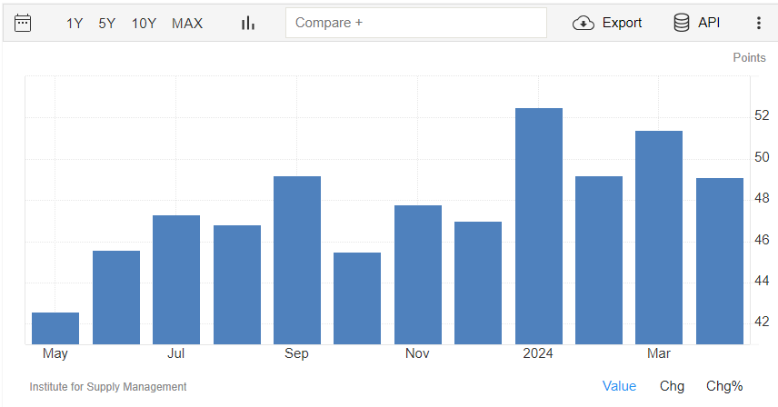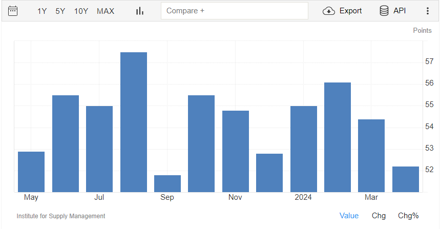Il PMI del settore dei servizi rilasciato da ISM, invece, scende dai 51,4 punti di marzo ai 49,4 punti di aprile, in direzione opposta rispetto ad un consensus che indicava una crescita a 52,0 punti.
