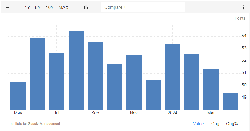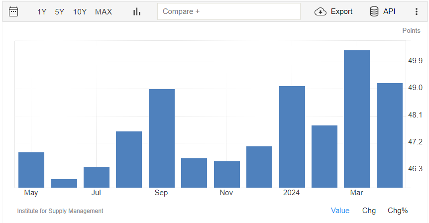 Il PMI manifatturiero rilasciato da ISM, invece, passa dai 50,3 punti di marzo ai 49,2 punti di aprile, sotto al consensus di 50,0 punti.