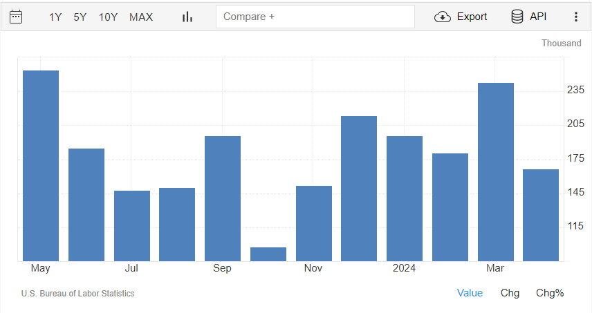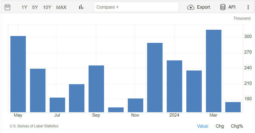Nel settore non-agricolo ad aprile sono stati creati 175 mila posti di lavoro, rilevazione in calo rispetto ai 315 mila posti di lavori creati a marzo (rivisti da 303 mila) e sotto al consensus di 243 mila.