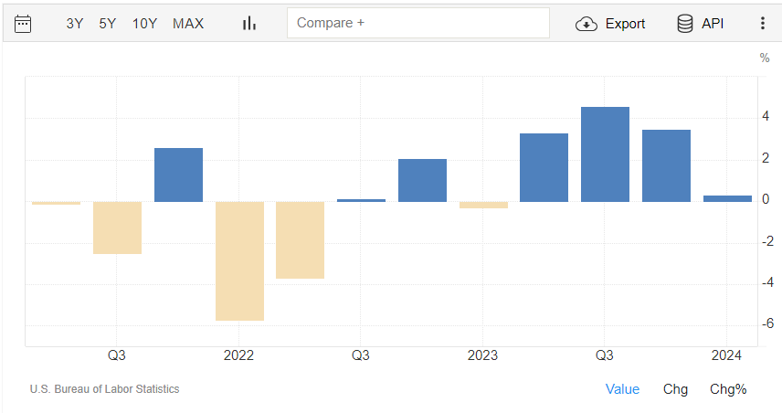 Il dato preliminare del primo trimestre 2024 sulla produttività nel settore non-agricolo segna un +0,3%, in evidente rallentamento rispetto al +3,5% del quarto trimestre 2023 (rivisto da +3,2%) ed anche sotto al consensus del +0,8%. Il dato è rilasciato dall’U.S. Bureau of Labor Statistics.