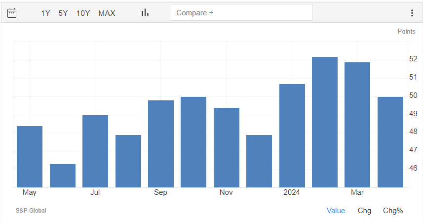 Il PMI manifatturiero S&P Global ad aprile si attesta a quota 50,0 punti, appena sopra al dato preliminare di 49,9 punti ed in calo rispetto ai 51,9 punti di marzo.