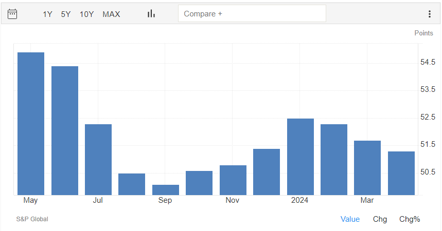 Il PMI S&P Global relativo al settore dei servizi ad aprile si attesta a quota 51,3 punti, oltre il dato preliminare di 50,9 punti, ma sotto alla rilevazione di marzo di 51,7 punti.