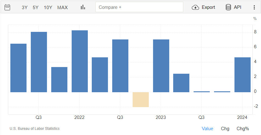 Il dato preliminare del primo trimestre 2024 dei costi unitari del lavoro segna un +4,7%, crescita che fa registrare una forte accelerazione rispetto al +0,0% del quarto trimestre 2023. Il dato è rilasciato dall’U.S. Bureau of Labor Statistics.