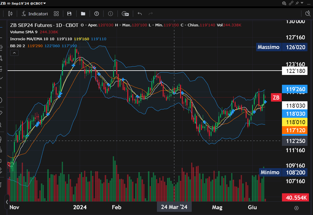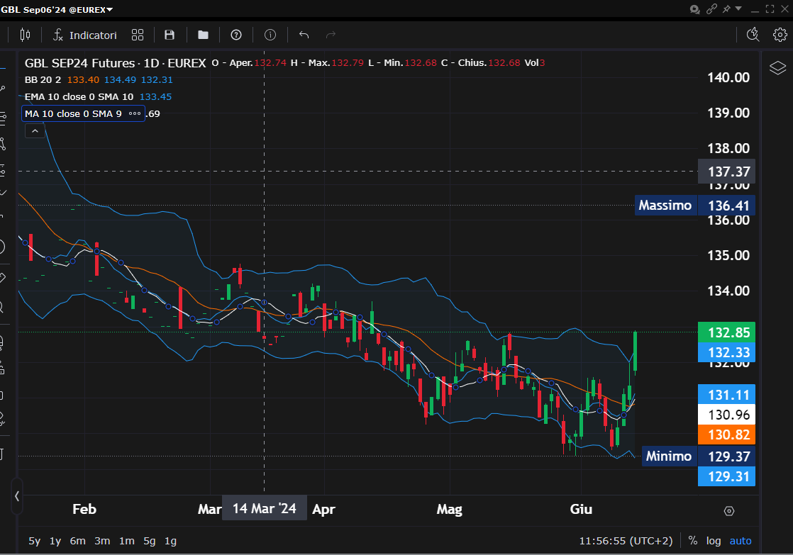 Personalmente preferisco i titoli a lunga scadenza perchè offrono dei margini di guadagno più importanti e per i riferimenti tecnici dei valori importanti per alcuni dei titoli di Stato personalmente seguiti in quanto ad analisi tecnica, vi rinvio all'articolo della scorsa settimana al link: https://www.lombardreport.com/2024/6/5/speciale-titoli-di-stato-prima-della-bce/