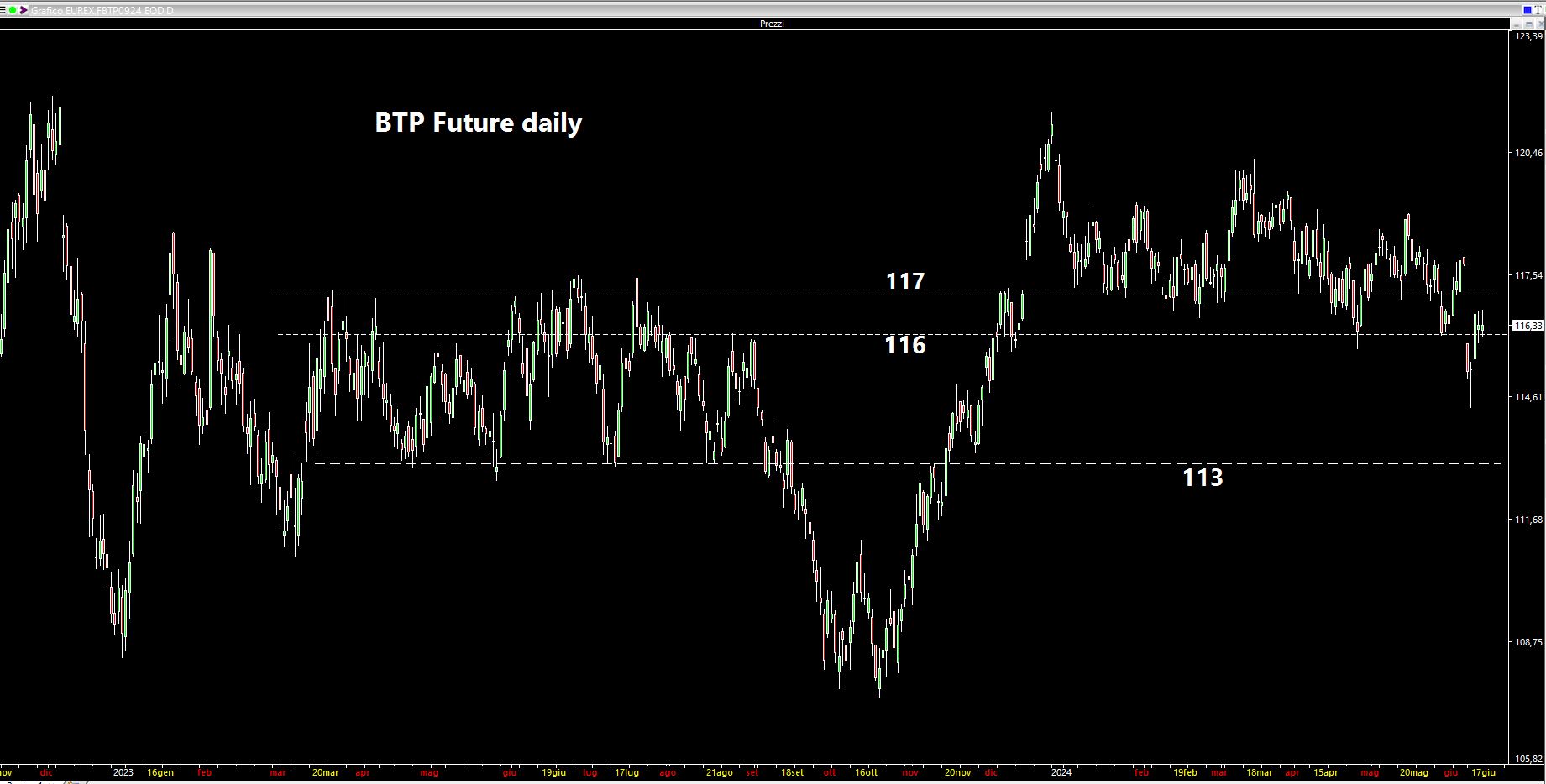 Portafoglio azionario scarico (ma carico di bonds). Per prima cosa faccio notare come lo spread sul bund si sia allargato salendo da 130 punti fino a 150 durante la settimana. Sul grafico daily c'è infatti stato il breakout dell'area compresa fra 117 e 116. La mancata tenuta dell'area posta a 116 punti potrebbe portare ad un ulteriore indebolimento verso 113. Spesso movimenti di questo tipo avvengono proprio in concomitanza del rolling dei contratti sulla nuova scadenza. In questo contesto il rendimento del BTP decennale si è attestato attorno al 3.92%. Questo andamento va contestualizzato nell'esito delle elezioni francesi perché anche se Macron non se ne andrà, la presenza della destra è vista come fumo neglio occhi da parte dei rigoristi (maggior deficit e maggior debito).