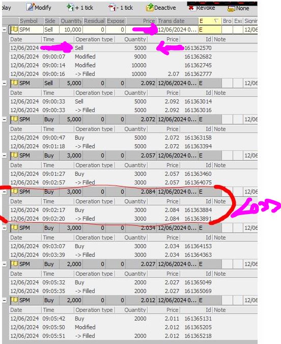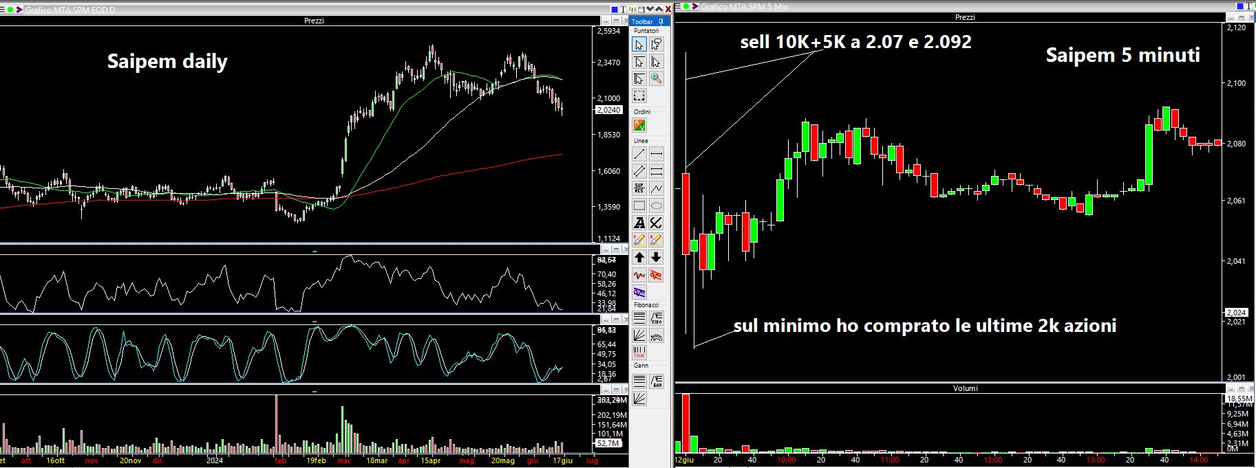 Un'ultima considerazione. In settimana è capitato un "fantaccio" come dico io e questo mi ha fatto pensare e mi induce ad essere IPER prudente nell'operatività che ho ridotto al lumicino. E' infatti uscita la notizia di un bookbuilding sul titolo Saipem (cessione di quota del 10% da parte di ENI). Prezzo finale a 1,97 euro. Ne avevo shortate una manciata la sera prima al prezzo di 1,99 euro (3000 pezzi). Il giorno seguente la notizia Saipem ha aperto a 2.07 euro (martedì aveva chiuso a 2,065 euro). I software hanno cercato inizialmente di far salire il titolo. Morale: ho dovuto fare i salti mortali per recuperare il loss della sera prima (chiuso a 2,08 euro, vado a memoria) ed andare in gain sulla parte di intraday fatta nei primi dieci minuti di negoziazione. La mia considerazione è che gli algoritmi, oltre a manovrare all'unisono, creano i punti di swing. Per questo motivo inizialmente le ho ri-shortate (10mila pezzi+5000=15mila pezzi totali a cui si sommavano chiaramente i 3000 della sera prima), scalettando mano a mano i riacquisti e chiudendo esattamente sul minimo di seduta gli ultimi duemila pezzi rimasti. Di seguito la parte cerchiata in rosso rappresenta il loss della sera prima (270 euro con soli 3000 pezzi venduti a 1,99 euro), mentre all'ultima riga trovate l'acquisto sul minimo di seduta degli ultimi 2mila pezzi lasciati correre molto bene. L'ennesima dimostrazione di quanto gli algoritmi, ormai monopolisti sul mercato, riescano a fare quello che vogliono. Ma il trader li può sfruttare in scia al movimento che creano dal momento che sono abbastanza "ignoranti" e sono solo una formula.