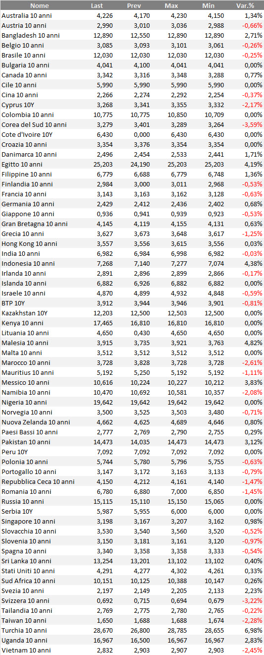Tabella dei rendimenti, su base settimanale, delle obbligazioni governative mondiali con qualunque rating.
