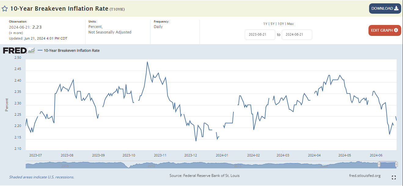 In lieve risalita i tassi reali, al netto dell’attuale tasso di inflazione, nonostante il debole dato sulle vendite al dettaglio della scorsa settimana. Come mostrato dal grafico del breakeven inflation a 10 anni, in chiusura di ottava il tasso risale al 2,23% dal 2,17% di due venerdì fa (v. grafico):