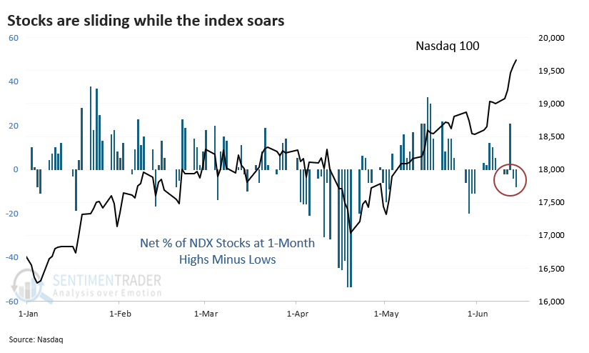 1) Mentre il NASDAQ100 sale ai massimi storici, sempre meno titoli sono in trend rialzista, mentre altri stanno toccando nuovi minimi.