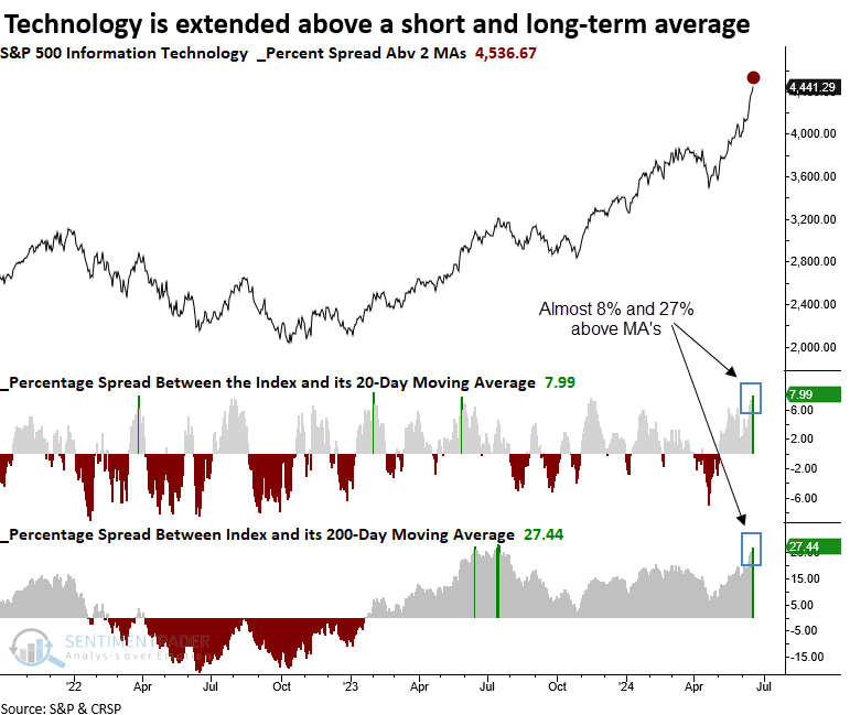 Nell’ultimo mese, il settore tecnologico dell’S&P500 ha registrato un’impennata, alimentato dalla domanda di titoli legati all’intelligenza artificiale, in particolare nel settore dei semiconduttori. Questo aumento dei prezzi ha spinto il settore ben al di sopra delle sue medie mobili a 20 e 200 giorni, un’impresa raggiunta solo altre 13 volte nella storia escludendo eventi ripetuti.