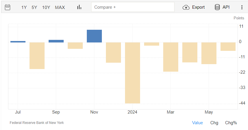 L’indice manifatturiero del New York Empire State a giugno si attesta a -6,00 punti, rispetto ai -15,60 punti di maggio. Il dato è rilasciato dalla Federal Reserve Bank di New York.